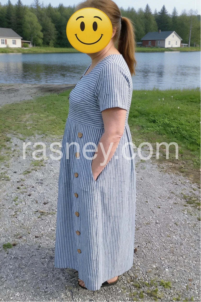 Blue Striped Buttons Midi Dress with Pockets